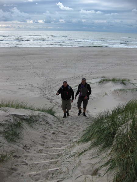 Bei Orkan zum Strand: Ina und ich haben auf dem Dünenkamm über 50Knoten gemessen. Der Sand war wie Peeling auf der Haut.