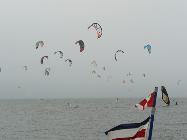 Das zweite Worldcup Wochenende war das komplette Gegenteil: Regen, Wind…nur eins hat gefehlt: Sonne. Stattdessen ist das gesamte Eventgelände am Nachmittag abgesoffen, so stark hat es geregnet. Dafür sind wir aber noch eine Runde Kiten gewesen. Inka, unsere Auswanderin aus Bonaire, schnürte sich ihren Schal noch etwas fester um den Hals, weil ihr schon bei dem Anblick von mir im Neo frierte. Karibikkiter sind halt Warmduscher