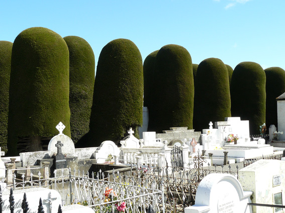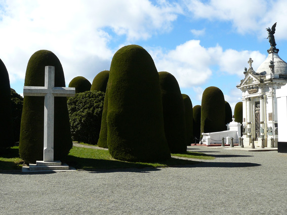 Nach einer kleinen Stadteinweisung unseres Hostelpapas ging es dann auf den weltberühmten Friedhof der Stadt, der mittlerweile zum Nationaldenkmal erklärt wurde. Hier lässt sich noch besser als in der Innenstadt der verflossene Reichtum bewundern. Jede Familie, die es sich leisten konnte, baute ihren Toten ein Mausoleum. Am beeindruckendsten aber waren die hochgewachsenen Bäume, die die Alleen des Friedhofs bildeten und aussahen wie riesige Gugelhupfe, die mutig ihre Köpfe in den patagonischen Wind recken.