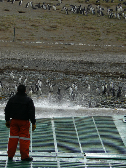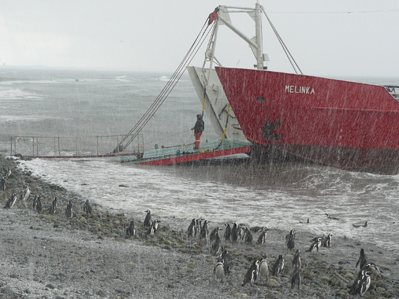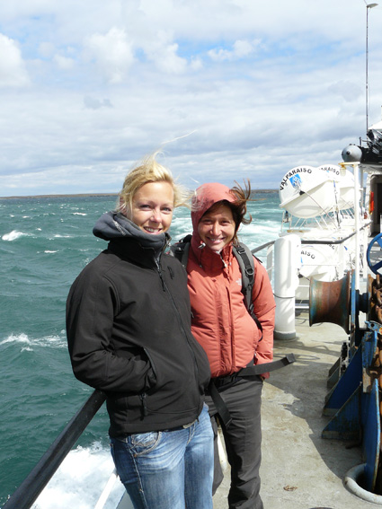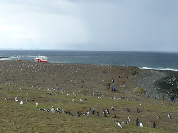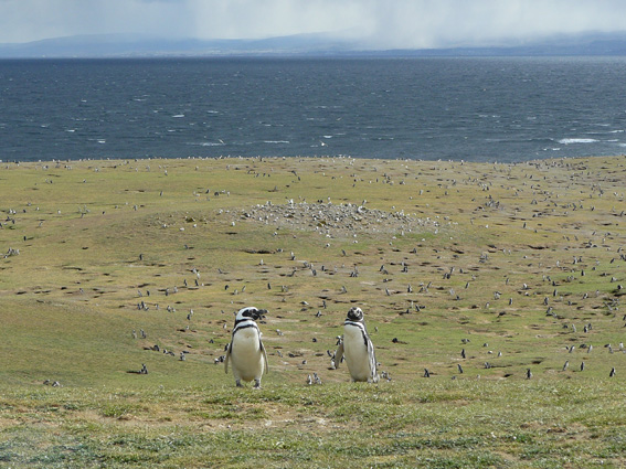 Auf der Isla Magdalena leben schätzungsweise 200.000 Magellan-Pinguine (Spheniscus magellanicus). Die Pinguine leben nur in den Sommermonaten hier, Ende März ziehen sie sich in wärmere Gewässer zurück und kehren – ohne zwischendurch an Land zu gehen – erst Ende Oktober wieder. Die Isla Magdalena liegt direkt in der Magellanstrasse und so führte uns unsere 2 stündige Bootstour einmal quer durch die Magellanstrasse. Die Überfahrt war recht windig und wellig und so wurde das Anlegemanöver unseres Bootes auf der Insel zu einem kleinen Abenteuer.