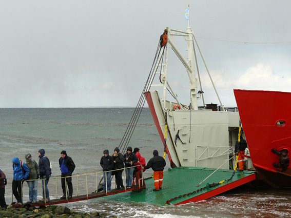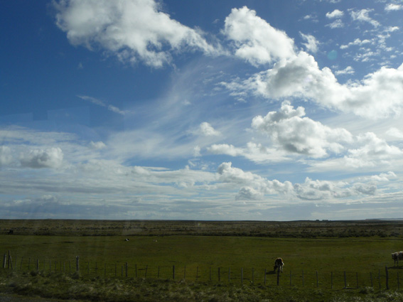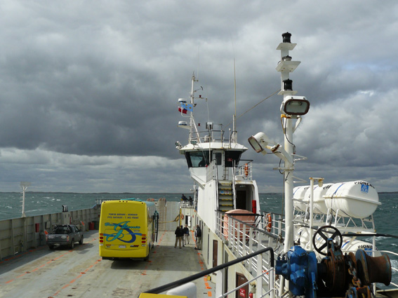 Die Busfahrt führte uns erst ein paar Stunden entlang der Magellanstrasse bis hin zum Fähranleger, an dem es dann hinüber nach Feuerland gehen sollte. Die Überfahrt dauerte keine halbe Stunde und wir konnten kleine Delfine in der Bugwelle tauchen sehen.