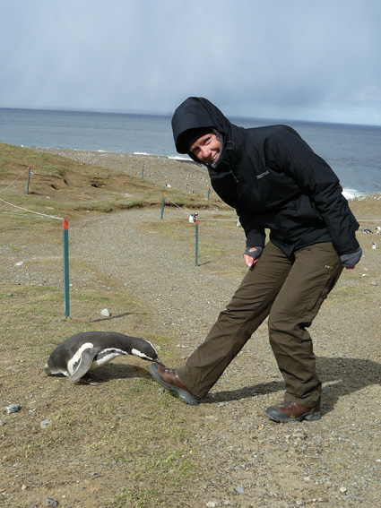 Schon am Strand standen die Pinguine in Scharen und beäugten uns gespannt, als wir unbeholfen über Steine kletternd die Insel betraten. Die gesamte Insel war bevölkert mit Pinguinen. Wohin das Auge reichte standen die kleinen in ihren Fracks herum. Obwohl der Weg für uns Besucher mit einem Seil markiert war, kam es einem vor, als würde man mitten durchs Wohnzimmer der Pinguine spazieren. Die meisten Tiere machten keine großen Anstalten, zu flüchten, oder sich in ihre Erdhöhlen zurück zu ziehen, viele schienen uns gar nicht zu bemerken. Einer der Pinguine mochte allerdings meine Schuhe nicht und kam immer wieder auf mich zugerannt und hackte munter mit seinem spitzen Schnabel auf meine Yaklederwanderstiefel ein.