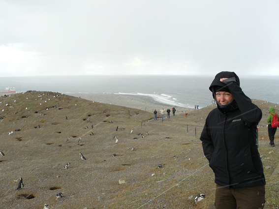 Auf unserem Weg zum Leuchtturm der Insel sahen wir bereits das Unwetter aufziehen. Auch unsere Reiseführerin wirkte schon leicht beunruhigt und versuchte uns schnell wieder zum Boot zu buchsieren. Vom höchsten Punkt de Insel aus gab es dann noch mal einen traumhaften Blick auf die gesamte Kolonie der Insel, bis es dann mit einmal wie verrückt anfing zu hageln. Der Hagel fiel nicht etwa von oben auf uns herunter, nein, er wurde uns mit mindestens 6 Windstärken quer in Gesicht geschleudert. Man konnte nicht mehr geradeaus schauen, nur zum Boden und ab aufs Boot. Innerhalb kürzester Zeit färbte sich die gesamte Insel weiß, was keinen der kleinen Pinguine zu stören schien. An Bord wartete dann eine heiße Schokolade, ein leckeres Sandwich und eine 2stündige Rückfahrt nach Punta Arenas auf uns. Was für ein toller Tag!!