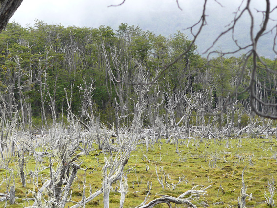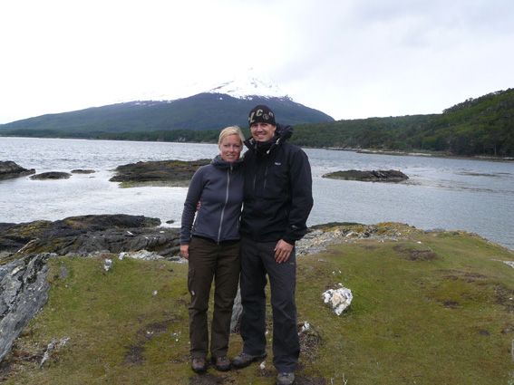 Um unsere müde Beinmuskulatur ein bißchen auf Vordermann zu bringen und für den Torres del Paine Nationalpark zu trainieren, wollten wir heute eine eintägige Wanderung durch den Nationalpark Tierra del Fuego machen. Fast jeder Traveller, der es bis hier unten nach Feuerland geschafft hat, verbringt ein bis drei Tage im Nationalpark, der nur 18km westlich von Ushuaia liegt und direkt an die Grenze Chiles stößt. Der südliche Teil des Nationalparks ist super erschlossen und mit wunderschönen Wanderwegen markiert. Wir sind direkt morgens gestartet mit einem Bus, der uns direkt zum Parkeingang brachte. Von dort aus führte uns der Weg entlang des Wassers durch eine faszinierende Landschaft. Schroffe Klippen und in Wolken gehüllte, schneebedeckte Berge wechseln sich ab mit tiefem, undurchdringlich erscheinendem, kaltem Regenwald. Es gibt idyllische Ecken wie die Bahia de Lapataia, aber auch überschwemmte Waldgebiete, wo die Bäume verfaulen, langsam umfallen, von Biebern abgenagt und tot in den Himmel ragen. Der Treck war wirklich schön, nicht zu anstrengend und nicht zu hoch, nur die großen schwarzen Wolken am Horizont machten uns Sorgen.