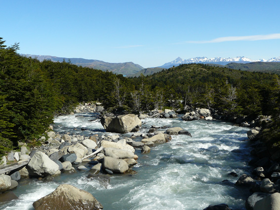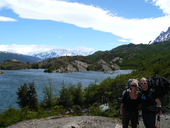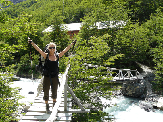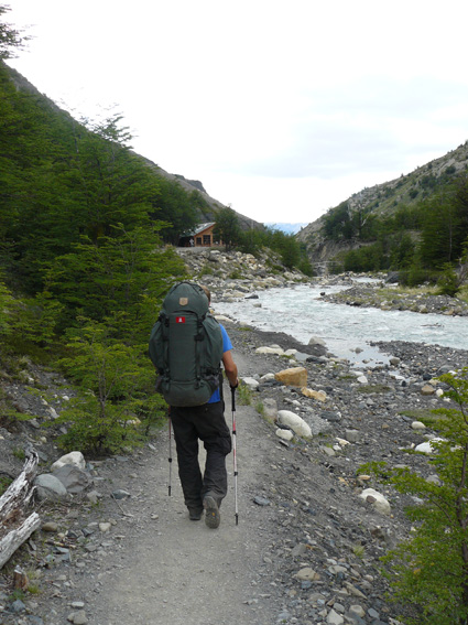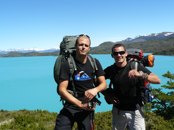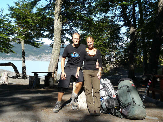 Nach gut drei Stunden waren wir dann wieder zurück am Ausgangspunkt Refugio Paine Grande. Wie der Zufall es so wollte, trafen wir da natürlich wieder auf Michi und Tim, die schon mit einem klassischen Sonnenbrand vom ersten Tag zu kämpfen hatten. Lost im Torres del Paine…Nach einem kleinen Pläuschchen und einem deftigen, überteuerten Mittagessen (Hamburgesa con Queso!!) hatten wir noch einen 7,6km langen Marsch zum Campamento Italiano vor uns. Aber auch das war nach 2,5 Stunden überstanden und wir konnten zufrieden unser Zelt platzieren. Leider war dieser Zeltplatz von zahllosen Sandfliegen heimgesucht, sodass man kaum den Mund aufmachen konnte, ohne nicht beim Einatmen vielleicht eines dieser kleinen Biester zu verschlucken. Für den ganzen Zeltplatz gab es ein Plumsklo und keine Dusche. Erfrischen konnte man sich in dem vielleicht 5Grad kalten Gletscherfluss, der tosend an unserem Platz vorbei rauschte. Auch hier gab es wieder eine Überraschung: Dana und Weston, die das „W“ von der anderen Seite (Ost nach West) aus liefen, waren auch am Campamento Italiano.