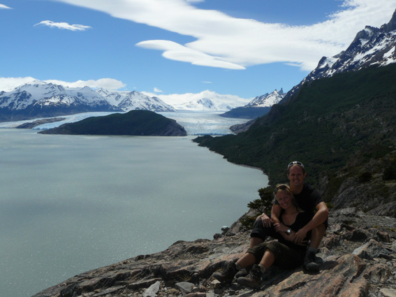 Der Treck entlang des Lago Grey schlängelte sich durch kleine Wälder, über Flüsse und immer wieder bergauf und bergab. Da kamen wir doch tatsächlich schon wieder ordentlich ins Schwitzen. Ohne Lichtschutzfaktor 30 geht hier gar nichts. Über Südchile gibt es leider so gut wie keine Ozonschicht mehr. Auf halber Strecke waren wir uns ziemlich sicher, dass wir schon so gut wie angekommen waren. Doch nach mehrfachem Nachfragen bei Trekkern, die uns entgegen kamen, hatten wir noch nicht mal den Mirador (Aussichtspunkt) auf halber Strecke erreicht. Mist. Da hat uns unser innerer Kilometerzähler wohl einen Streich gespielt. Der Mirador war einfach unschlagbar. Von dort oben konnte man auf den gesamten Gletscher schauen und Eisberge über den See treiben sehen. Nach etwas über 4 Stunden Fußmarsch erreichten wir dann doch etwas geplättet das Refugio Grey. Emily hatte sich am Ausgangspunkt im Refugio einen Platz im Dorm gebucht und musste nun die langen 11km komplett wieder zurück laufen. Wir hingegen bauten erst mal unser Zelt auf und kauften überteuertes Dosenbier am Refugio, was aber nach so einem Tag einfach fantastisch schmeckte.