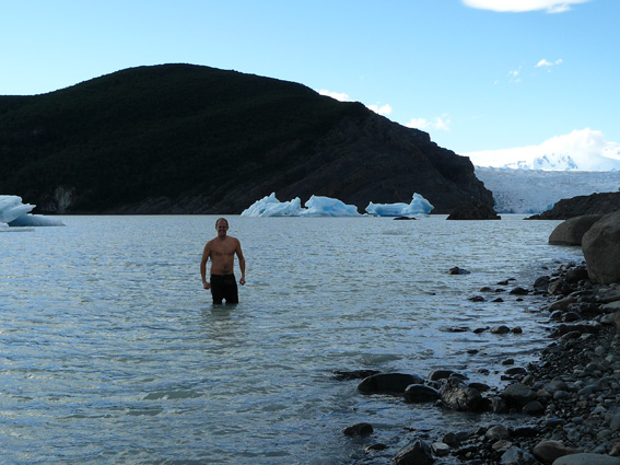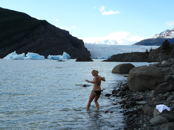 Vor dem Abendessen wollten wir aber unbedingt noch im Gletschersee baden gehen. Einmal im Leben vor einem Gletscher schwimmen. Und so machten wir drei und bewaffnet mit Boardshort und Bikini auf dem Weg zum ‚Strand‘. Nach ungefähr zwanzig Minuten erreichten wir einen abgelegenen Steinstrand, der von der Campsite nicht einsehbar war. Wir sind alle drei nacheinander in das mehr als eisigkalte Wasser gesprungen. Das Schlimmste waren eigentlich die Füße, die in Sekundenschnelle zu Eisklötzen gefroren, sodass man ohne Schmerzen kaum laufen konnte. Was für ein Erlebnis!!! Nils hat es sogar geschafft, bis zu einem kleinen Eisberg zu schwimmen und zurück. Hut ab!!