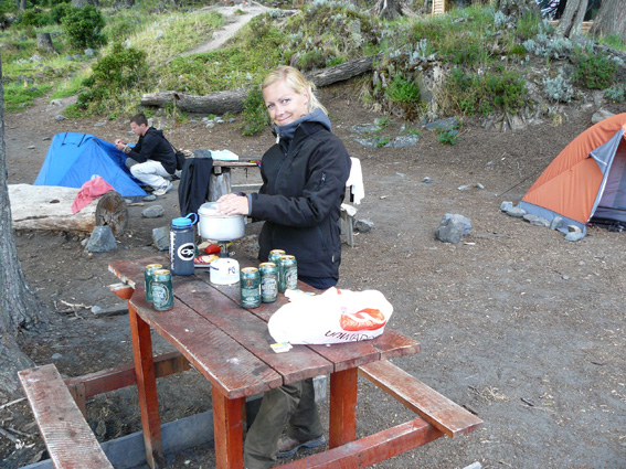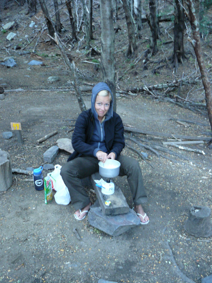 Zurück zum Camp hieß es nun Abendbrot machen. Paul hatte bereits über die Köpfe der Mädels hinweg entschieden, was heute in welcher Reihenfolge zum Abendbrot gekocht wurde. Wir entschieden uns nach langem Überlegen für Nudelmixmitfertigsoße al Pollo und Milchpulver. Das Ganze wurde zur Feier des Tages aber mit schnöder Tomatensoße von Dale (letzte Tüte!) aufgepeppt. Mit unseren kleinen Gaskochern durfte auf dem Campingplatz lediglich in einer kleinen, halboffenen Holzhütte gekocht werden, und so wurde es recht gemütlich dort mit all den anderen hungrigen Trekkern aus allen Herren Ländern. Highlight war allerdings das Poppen unseres Weinkorkens beim Öffnen unser Weißweinflasche…für ein paar Sekunden herrschte Stille im Camp…fast konnte man das Echo des Korkens von den Torres wiederhallen hören. Wir wurden angestarrt, als hätten wir gerade eine 5 Literflasche Moet Chandon geöffnet. Die neidischen Blicke der anderen auf unseren Bechern genossen Dale, Nils und ich unseren Vino zu unserem leckeren Abendbrot. Danach wurden noch ein paar Travellergeschichten ausgepackt und dann gings auch schon wieder ab ins Zelt, schließlich war um 4.45Uhr Aufstehen angesagt, um die Torres im Sonnenaufgang rot werden zu sehen. Vielleicht haben wir ja Glück.