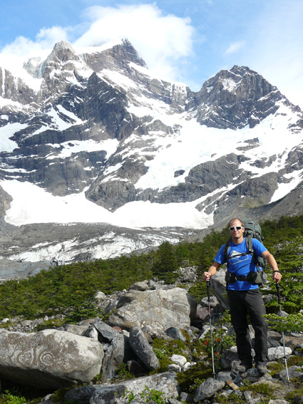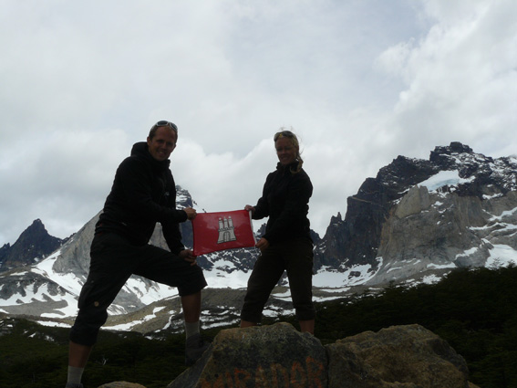 TAG 3: Geweckt vom Zeltabbaulärm unserer Nachbarn hieß es heute Morgen früh aufstehen. Erstes Etappenziel für heute sollte der Anstieg zum 7,5km entfernten Mirador im Valle del Frances sein, diesmal aber ohne Rucksack, da wir auf dem Rückweg eh wieder am Campamento Italiano vorbeikommen würden. Langsam wurde mir auch klar, warum man den Treck das „W“ nannte. Nach einem leckeren Frühstück mit Porridge (Haferschleim) mit Milchpulver und grünem Tee mit Fruchtgeschmack machten wir uns an den Aufstieg ins Valle del Frances. Mittlerweile hatte sich und der Frenchcanadien Pierre angeschlossen. Auch Hanno war noch immer mit von der Partie. Dale ja sowieso. Allerdings gingen alle ein unterschiedliches Tempo, sodass man sich ständig gegenseitig überholte und überholt wurde. Alles in allem eine echt nette Truppe. Vor allem Hanno begeisterte uns immer wieder mit seiner unglaublich fröhlichen Ausstrahlung. Er fährt derzeit mit dem Fahrrad von Patagonien hoch nach irgendwo…die verrückten Bayern!! Nach gut drei Stunden Kraxelei über Stock und Stein am Mirador angekommen, haben wir dann alle erst mal gemeinsam Kekse, Nüsse und Müsli gefuttert und ein paar tolle Bilder von der uns einschließenden Bergkette gemacht.