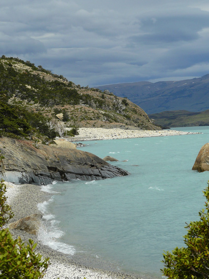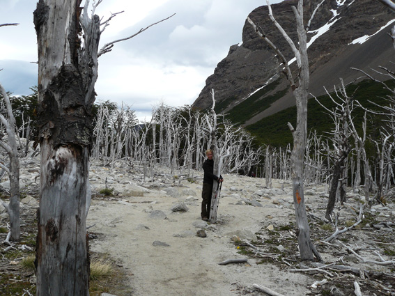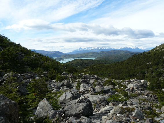 Nach 2,5 Stunden waren wir dann wieder im fliegenverseuchten Campamento Italiano angekommen. Zelt und Rucksäcke waren auch noch da. Nach einer halben Packung chilenischer Pringels con Queso musste dann schleunigst das Zelt abgebaut werden und der Marsch zum Refugio Los Cuernos begonnen werden. Das waren noch mal ungefähr 5,5km über Stock und Stein entlang des Lago Nordenskjold. Der Weg war nicht weniger schwer zu gehen als der Anstieg ins Valle del Frances und so dauerte es knapp drei Stunden, bis wir endlich am Campamento/Refugio Los Cuernos (die Hörner) waren.
