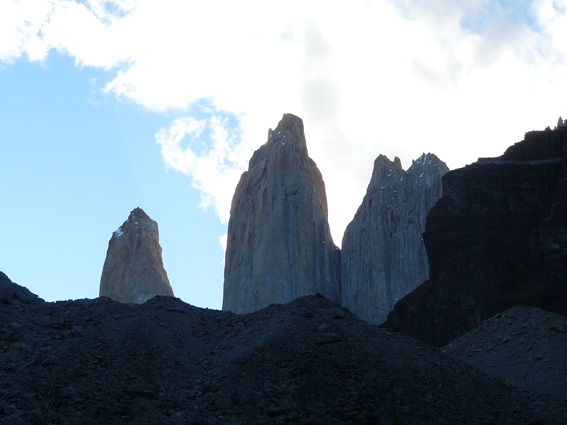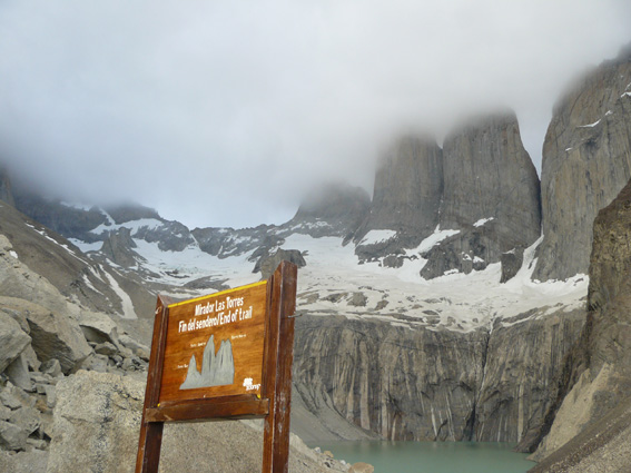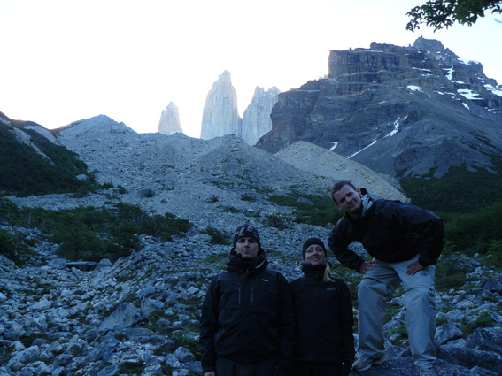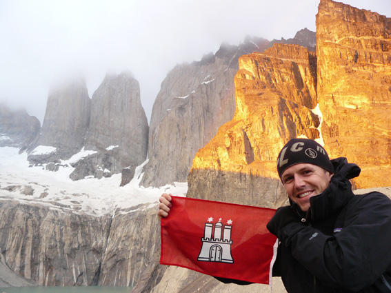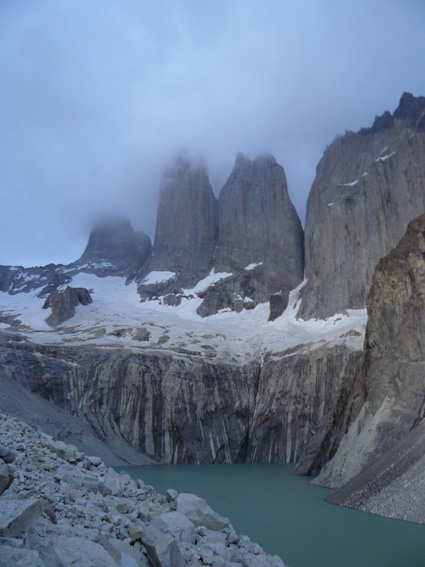 Und dann nach einer Stunde, der Himmel wurde langsam immer heller, kamen wir ‚oben‘ an. Jeder suchte sich sein Plätzen auf den riesigen Geröllsteinen mit Blick auf die Torres (Türme) und die Lagune unterhalb der Torres. Das Bild hätte nicht schöner sein können – naja, höchstens ohne Wolken vielleicht. Die hielten sich nämlich wacker um sämtliche Spitzen der Torres. Der Anblick war trotzdem atemberaubend!