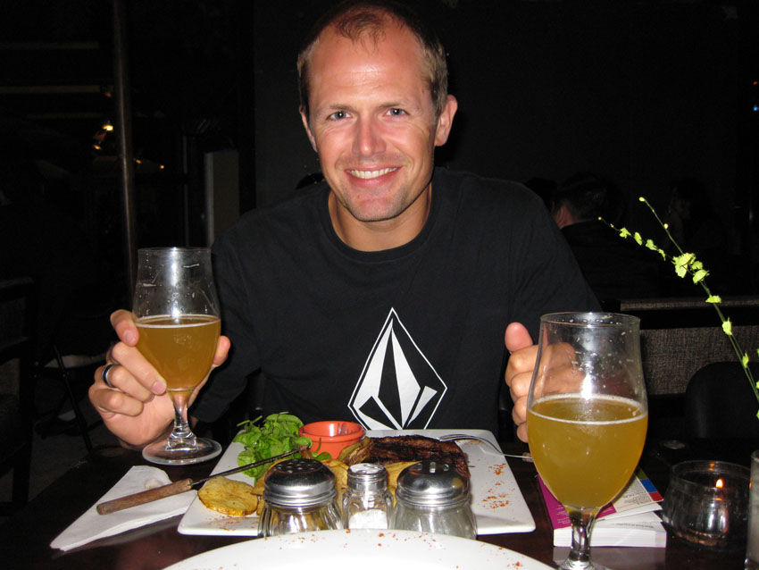 Völlig übermüdet hoben wir um 23.30Uhr in Miami ab. Kaum in der Luft wartete auch schon das nächste Unwetter auf uns. Angeschnallt in unseren Sitzen in der vorletzten Reihe der Holzklasse wurden wir mächtig durchgeschüttelt. Selbst die Stewards hatten Probleme, mit ihren kleinen Getränkewagen nicht wie betrunken durch die Gänge zu fahren. Eigentlich wollten wir schlafen, aber das war bei den Turbulenzen völlig aussichtslos. Selbst als wir unsere Flughöhe erreicht hatten, wurde es nicht besser. Langsam schlug mein mulmiges Gefühl in ein wenig Angst über und so fragte ich höflich bei einem der Stewards nach, ob das wohl normal sei mit den Turbulenzen. Er grinste uns nur an und sagte: „Im hinteren Teil des Flugzeuges ist es immer unruhiger. Stellen Sie sich einen Hund vor, der gerade aus dem Wasser kommt und sich kräftig schüttelt. So fliegt es sich bei Unwetter in der vorletzten Reihe einer Boing 757 von American Airlines.“ Wie unglaublich beruhigend diese Worte auf uns wirkten, ist nicht zu beschreiben. An Schlaf war weiterhin nicht zu denken.