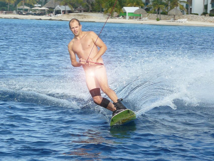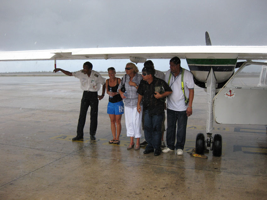 Doch der monsunartige Regen machte keine Anstalten, sich nach Bonaire oder Aruba zu verziehen und so standen alle Insassen klitschnass unter den Tragflächen der kleinen Maschine. Das Regenwasser stand uns mittlerweile bis in die Schuhe (Ich hatte in weiser Voraussicht nur Flipflops angezogen). Nach einer Viertelstunde unter den Tragflächen des Fliegers entschied der Pilot, dass er uns alle näher zum Flughafengebäude fahren würde. Alle Mann wieder rein in die Maschine, Propeller angeschmissen und ab ging die Taxifahrt. Im Flughafengebäude angekommen waren wir dann trotzdem bis auf die Haut durchnässt. Und dann traf ich auch noch unseren ersten Weihnachtsmann dieser Saison. Irgendwie komisch bei Sonnenschein und über 30Grad – da kommt keine Weihnachtsstimmung auf.