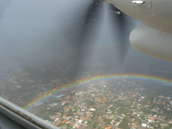 Doch dann wurde es recht holprig in der Luft und je näher wir Curacao kamen, umso dichter wurden die Wolken. Als wir gerade die Küste von Curacao erkennen konnten, verschluckten uns riesige, karibische Gewitterwolken, sodass es schien, als würden wir nicht mal die Landebahn finden. Auch der Pilot schien hektisch Ausschau nach der Landebahn zu halten. Das kleine Fenster des Piloten war zudem auch noch undicht und so regnete es munter in unseren kleinen Flieger hinein. Unter uns sahen wir mit einmal einen riesengroßen Regenbogen. Noch nie hatten wir einen Regenbogen aus dieser Perspektive gesehen. Wunderschön.
