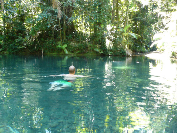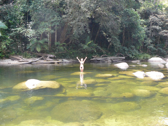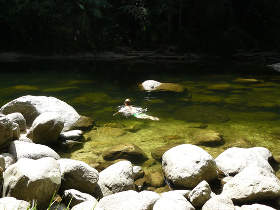 Nachdem wir nun also einiges über die Flora und Fauna des Daintree National Parks gelernt hatten, Kakadus und Vogelspinnen gesichtet hatten, machten wir uns auf den Weg zu einem Secret Spot: the blue hole!! Wir hatten den Tip von einer Einheimischen bekommen. Das ‚Blue Hole‘ ist nicht ausgeschildert und nur einige wenige fahren dort hin, weil es recht abgelegen im Regenwald liegt. Das sollte uns Abenteurer nicht abschrecken , und so folgten wir ihren Wegbeschreibungen, bis wir irgendwann endlich vor dem ‚Blauen Loch‘ standen. Das Wasser war eisigkalt aber sehr erfrischend…und wir waren allein. Ein bißchen Muffen hatten wir schon, dass es vielleicht doch Krokodile oder anderes Kleinvieh geben könnte dort im glasklaren Swimmingpool, aber außer ein paar Fischen haben wir dort kein Tier angetroffen…Gott sei Dank. Was hätten wir auch machen sollen, wenn plötzlich ein Krokodil auf uns zu geschwommen wäre??