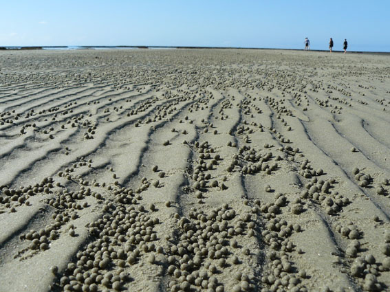 Den Nachmittag haben wir faulenzenderweise an unserem Traumstrand verbracht, ein wenig im Halbschatten der riesigen Palmen gedöst und sind dann in dem über 30Grad warmen Wasser plantschen gegangen. Ebbe und Flut bestimmen hier an der Ostküste das Bild der Strände. Wir hatten auflaufendes Wasser und so füllten sich die piewarmen Priele langsam mit etwas kühlerem Meerasser…so muss Urlaub sein. Unser Kiterherz schlug natürlich sofort Alarm, als wir diesen traumhaften Spot betraten. Flachwasser, 200m Stehrevier, endloser Strand und spiegelglattes Wasser – aber kein Kiter in Sicht. Wir hoffen sehr, bald an einen Kitespot zu kommen und endlich wieder aufs Brett steigen zu können!!