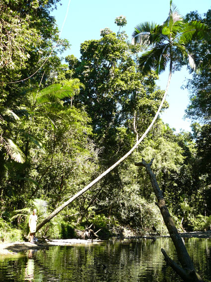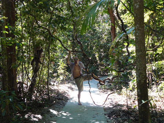 Leider mussten wir heute die gleiche Strecke wie gestern zurück fahren, da der Roundtrip mit der Straße an der Küste entlang nur für 4WD (Allradantrieb) ist. War trotzdem eine schöne Tour. Von Mossman aus ging es dann statt nach Süden noch mal hoch Richtung Norden zum Cape Tribulation. Mit der ‘Cable Ferry‘ haben wir heut Mittag auf das andere Ufer des Daintree Rivers übergesetzt. Danach hat man das Gefühl, in die Wildnis des Regenwaldes einzutauchen. Die Straße schmiegt sich ca. 35km lang an die Kontur der malerischen Küstenlinie mit wunderschönen Ausblicken aufs Meer ab und dann. Auf dem Weg nach Norden hat man zur Rechten die wunderschönen entlegenen Buchten mit einsamen Sandstränden, zur Linken den ‘Daintree National Park‘.