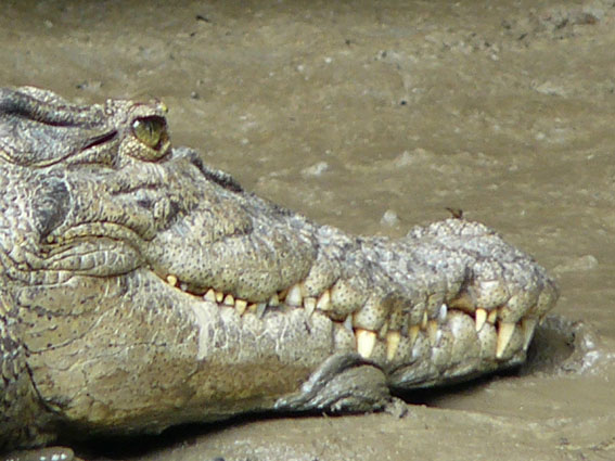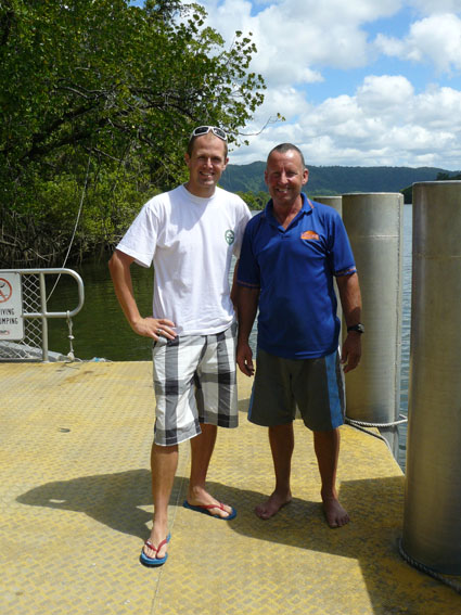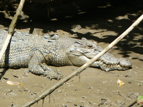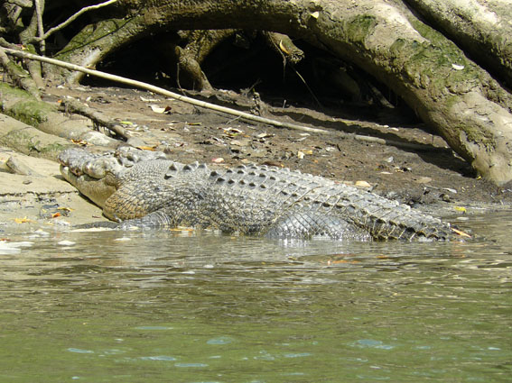 Die für gestern Nachmittag geplante Krokodiltour auf dem Daintree River hatten wir wegen der besseren Chance auf Krokodile auf heut morgen verschoben. Nach einem gemütlichen Frühstück auf unserem Campingplatz (good night sleep), fuhren wir zurück zum 15 Minuten entfernten Anleger für Boote. In Australien nennt man den Spaß ‚Croc Spotting‘, was sehr typisch für diese Regenwaldregion ist. Crocos liebes es feucht und heiß, da sie nur bei einer Körpertemperatur von über 24Grad ihre Nahrung verdauen können. Daher gibt es auch nur in diesen nördlichen, tropischen Regionen Krokodile. Erst saßen wir noch zusammen auf einen kleinen Plausch mit der netten Frau vom Ticketverkauf, bis es dann mit Dan, dem Croco Expert, auf eine einstündige Croc Spotting Tour in einem kleinen, solarbetriebenen Boot ging. Bereits nach fünf Minuten sahen wir unser erstes Krokodil auf einer der Riverbanks liegen.