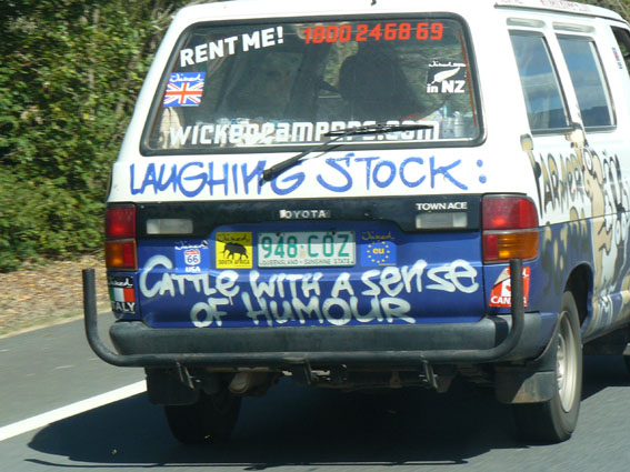 Unser Wicked Camper des Tages: „Laughing stock: cattle with a sense of humour“